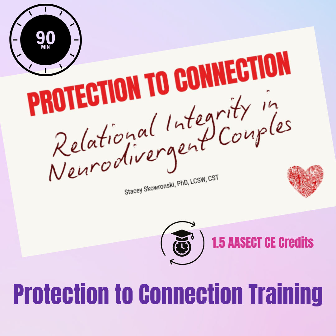 - Â 90-minute clinical training:Â From Protection to Connection: Relational Integrity in Neurodivergent Couples Work.