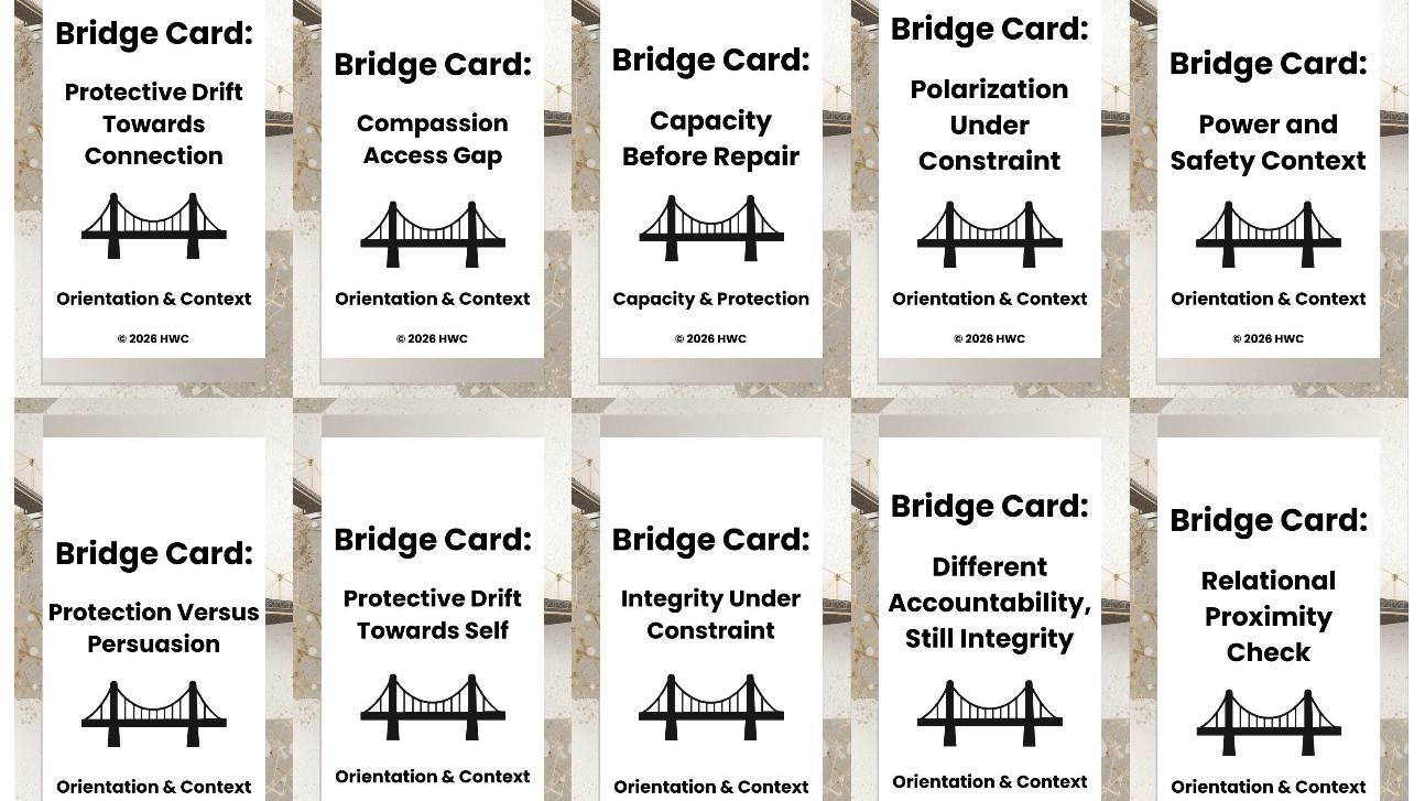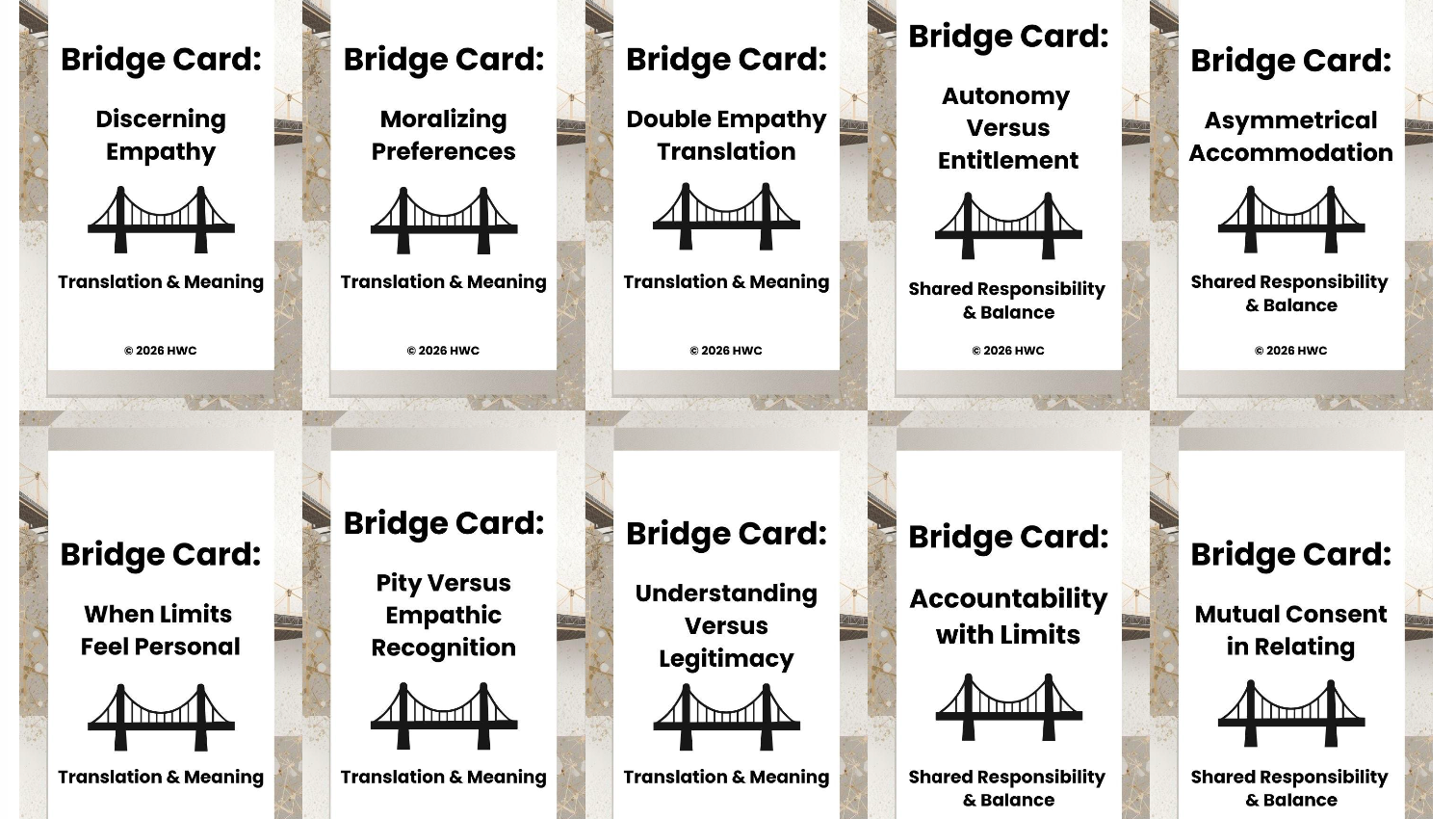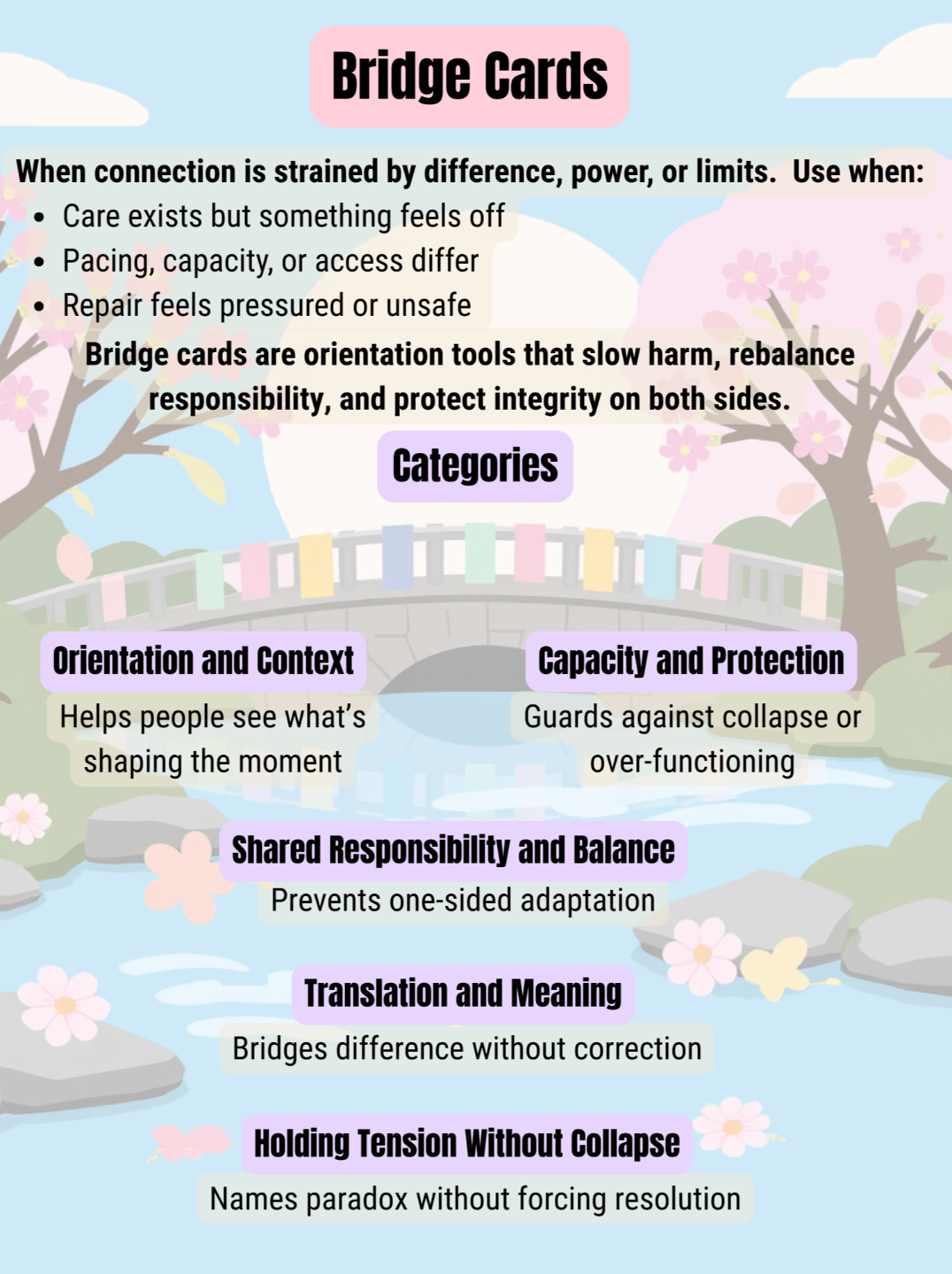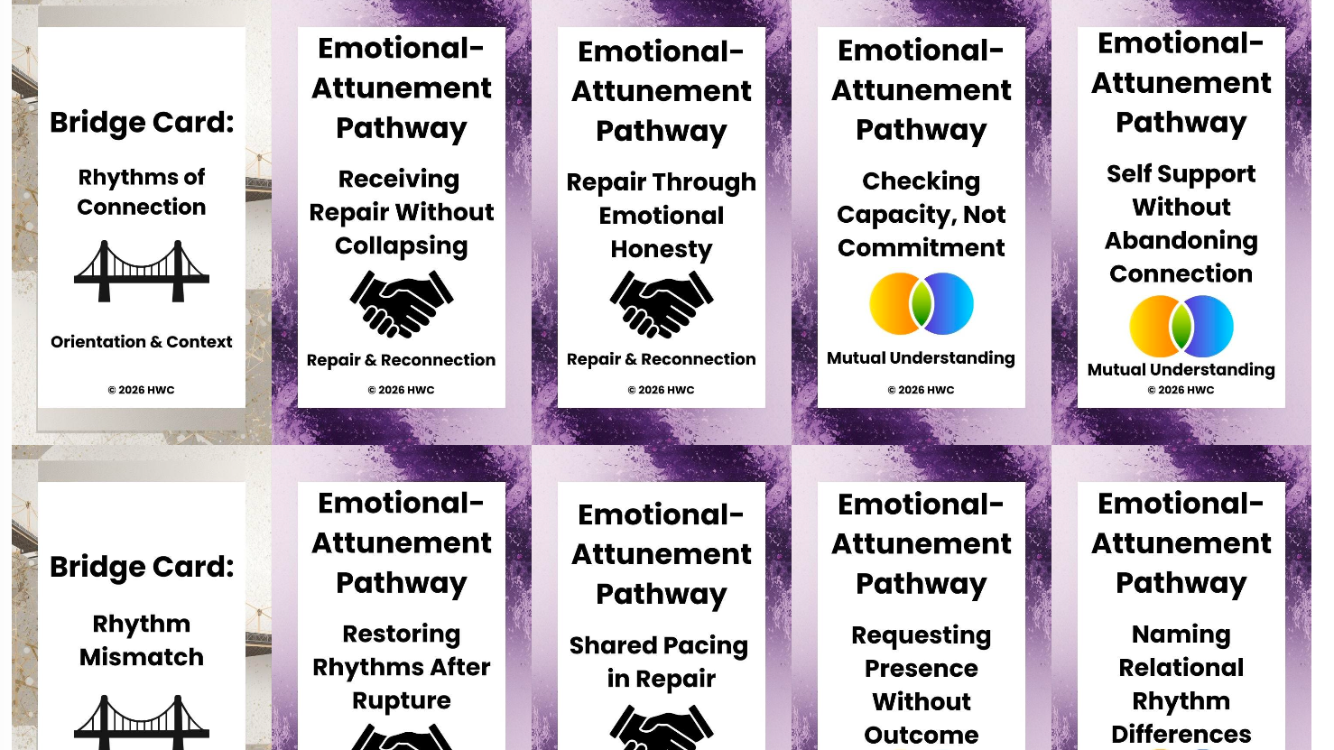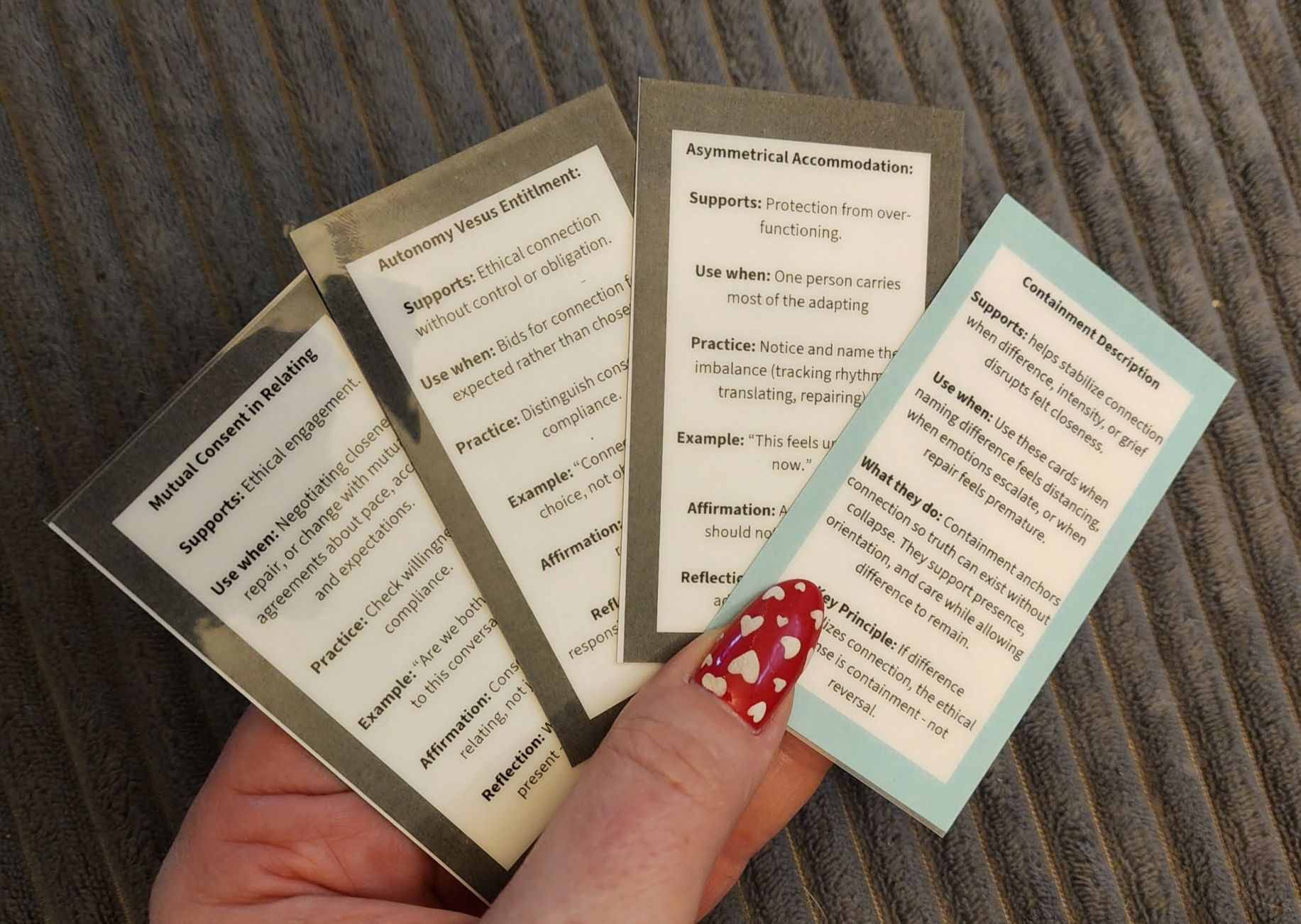 Disclaimer: Relational Integrity Cards are an educational and reflective tool. They are not therapy, clinical supervision, diagnosis, or a substitute for mental health care. Use of this deck is intended to support relational awareness, coherence, and ethical engagement. Professionals are responsible for applying these materials within the scope of their own training, license, and ethics.