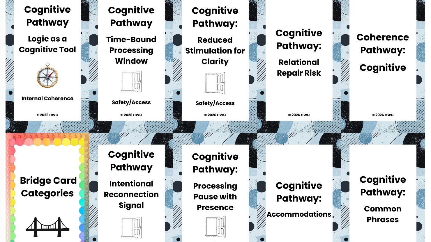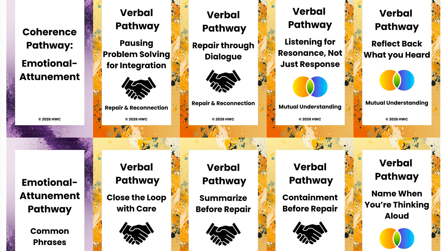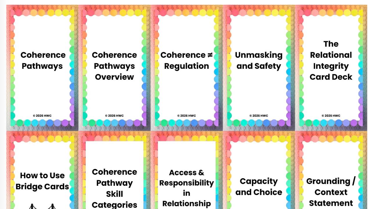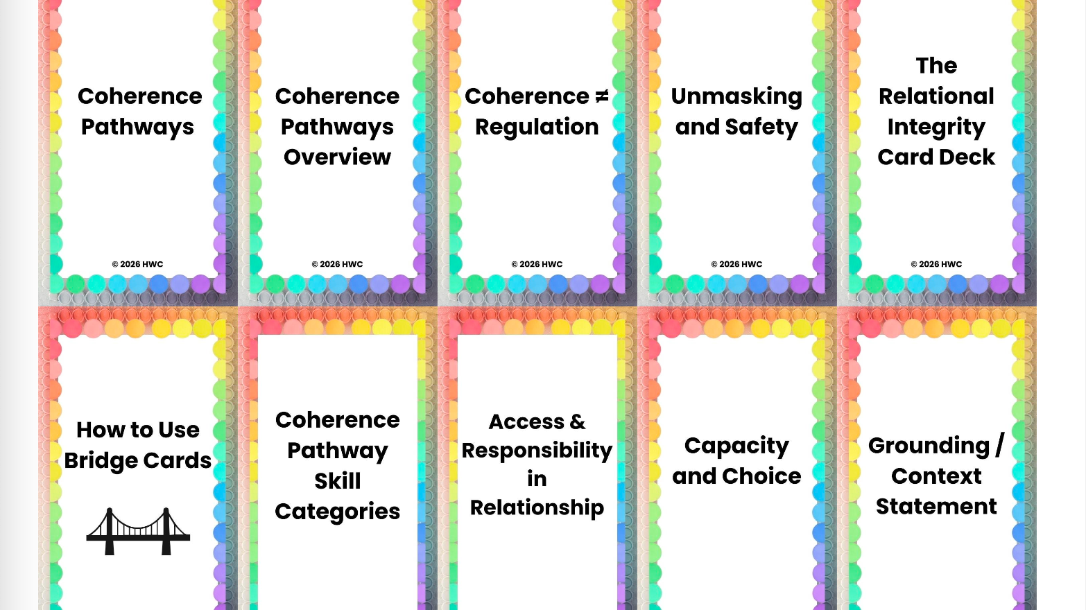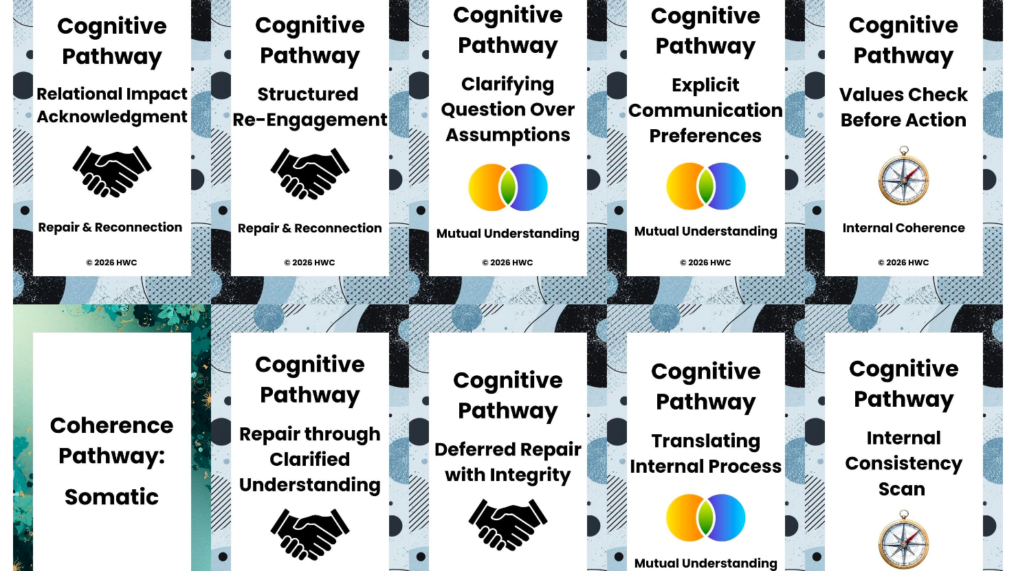 The coherence pathways described in this deck do not represent deficits, attachment failures, or mental health pathology. Each pathway engages relationship in a different way. None is more healthy, caring, or relational than another. Access is shaped by safety, context, power, and capacity. It may expand, contract, or remain stable depending on the situation.