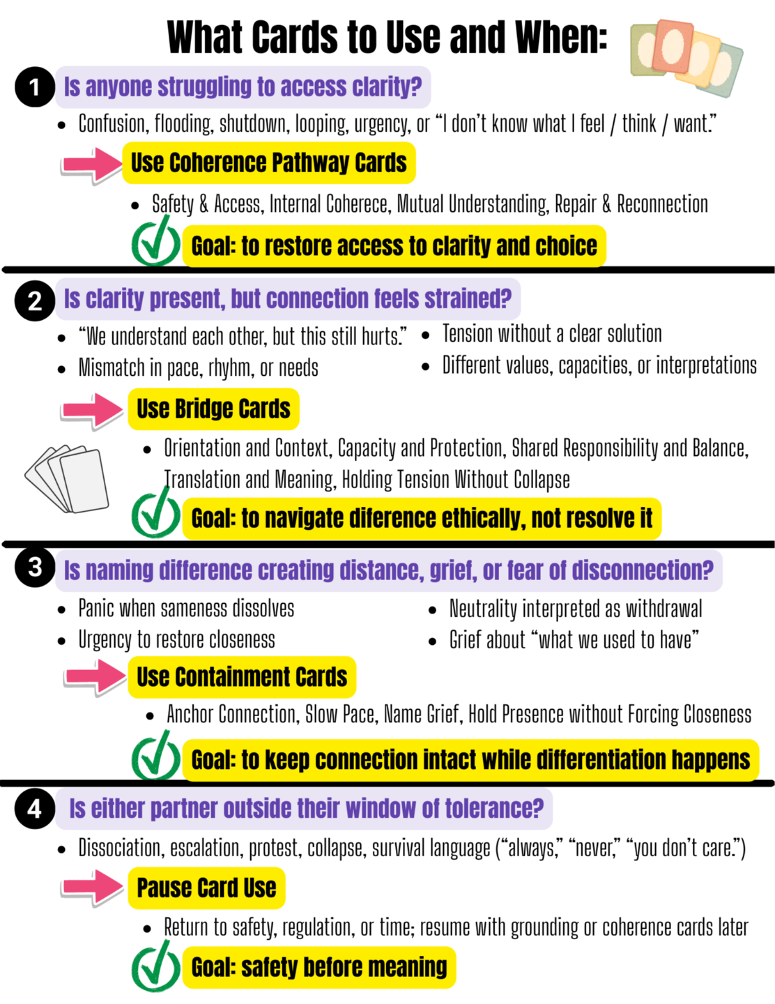 Within couples work, this card deck does not require emotional sameness, shared processing speed, or identical expressions of care. Instead, this deck centers coherence, integrity, and relational ethics, helping people: